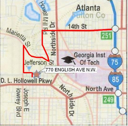 Visiting 770 English Avenue, south-west corner entrance We are located just west of Georgia Tech From Midtown take 14th street west till it ends at Howell Mill. Take a left then fork to the Right on Brady Avenue go two blocks and take a right on Marietta Street, go one block to the light and take a right at Joseph Lowery Blvd. go one long block and left on Jefferson Street. We are just across from Greyhound on Pains Avenue. Advance call suggested