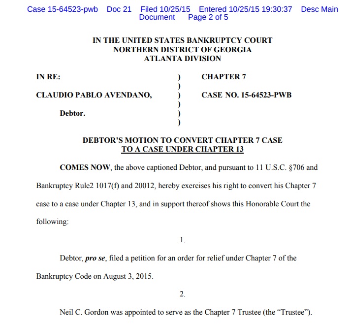 IN THE UNITED STATES BANKRUPTCY COURT NORTHERN DISTRICT OF GEORGIA ATLANTA DIVISION IN RE: ) CHAPTER 7 ) CLAUDIO PABLO AVENDANO, ) CASE NO. 15-64523-PWB ) Debtor. ) ) DEBTOR’S MOTION TO CONVERT CHAPTER 7 CASE TO A CASE UNDER CHAPTER 13 COMES NOW, the above captioned Debtor, and pursuant to 11 U.S.C. §706 and Bankruptcy Rule2 1017(f) and 20012, hereby exercises his right to convert his Chapter 7 case to a case under Chapter 13, and in support thereof shows this Honorable Court the following: 1. Debtor, pro se, filed a petition for an order for relief under Chapter 7 of the Bankruptcy Code on August 3, 2015. 2. Neil C. Gordon was appointed to serve as the Chapter 7 Trustee (the “Trustee”). 3. The Debtor filed this Chapter 7 case in order to stay the foreclosure of commercial property allowing him time to repay the mortgage arrearages. The property is located at 155 Liberty Road, Villa Rica, GA 30180 (the “Property”), which serves as his place of business and residence. 4. The current value of the Property is $374,370.00 based on the 2014 Douglas County Property Tax Assessments. Debtor’s ownership interest in the Property is subject to two (2)