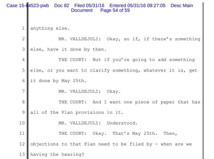 Page 53 THE COURT: Fourteen days - by May 25th, file an Amended and Restated Chapter 13 Plan as whatever it is that combines everything that’s ever been done, so we have on piece of paper to look at. Okay. MR. VALLDEJULI: Okay.